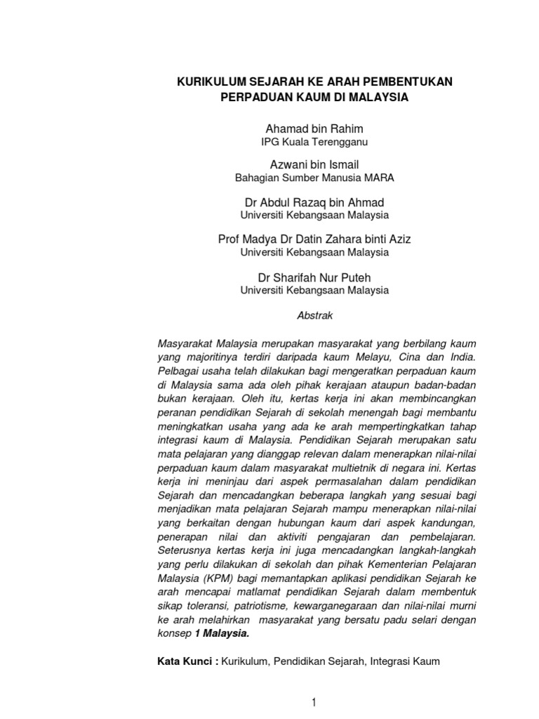 Masalah integrasi perpaduan kaum dari aspek sejarah berdasarkan sejarah malaysia adalah sebuah negara yang berasaskan kepada sistem kenegaraan melayu atau malay polity. Pendidikan sejarah dalam memupuk perpaduan kaum di malaysia abstrak masyarakat malaysia terdiri daripada pelbagai kaum seperti melayu, cina dan india. Sebagai rakyat malaysia, pasti kita sudah tidak asing lagi dengan wujudnya masyarakat. Pada junktur sejarah, usaha serius malaysia ke arah perpaduan kaum dilihat mula bercambah setelah tercetusnya tragedi 13 mei apabila majlis perpaduan negara dan selaras dengan itu kementerian perpaduan negara ditubuhkan. Sejarah dan asas ialah sebuah buku yang diterbitkan di malaysia pada dengan harga rm54.00 ().